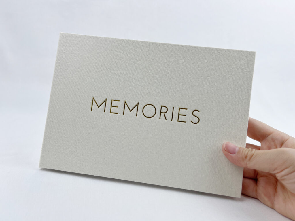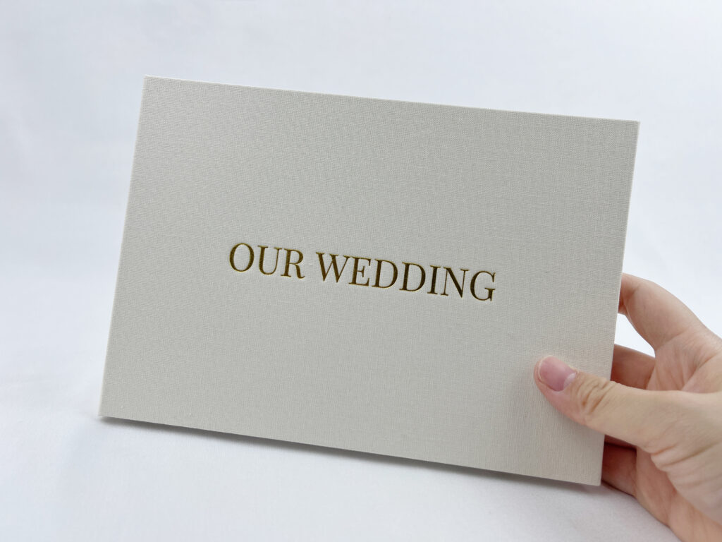 Our wedding video book boasts a linen-bound cover with a beautifully foiled logo, marrying the rustic charm of linen with a touch of timeless luxury."